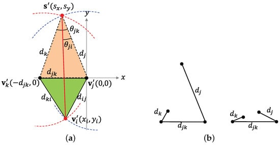 where (see Figure 3a for and ). If triangle inequality fails, i.e., or , then does not exist (see Figure 3b). In this case, we chose the minimum distance for , and the polar angle is determined as follows: