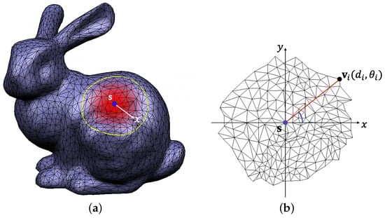 where is the geodesic distance to a vertex from , and r is a user-specified distance. Our goal is to find local parameterization based on geodesic polar coordinates. We took a similar approach proposed by Reference [], but present a different algorithm for improving computational efficiency.