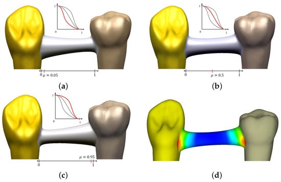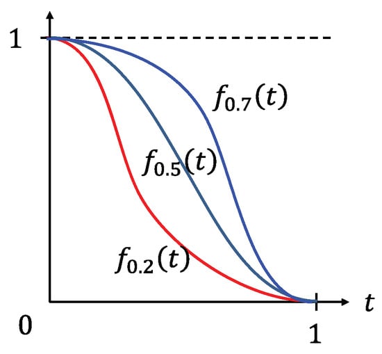 where parameter controls the shape of the blending function as shown in Figure 6. Figure 7 shows an example of a parametric blending surface generated by the linear combination of two base surfaces, and , in Figure 5b,d.