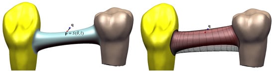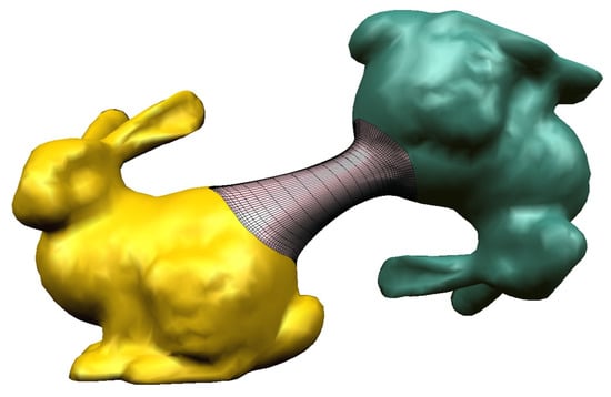 Hartmann [] introduced an effective method for blending parametric curves and surfaces. Let and be two parametric surfaces. This method constructs a parametric blending surface by a linear combination of two base surfaces and , where and are reparametrized subpatches of and , respectively. Song et al. [] extended this technique by proposing practical methods for reparameterizing the base surfaces to be blended. However, these techniques [,] are essentially based on the parametric representation of , and thus direct application to triangular meshes would be a considerably challenging problem.