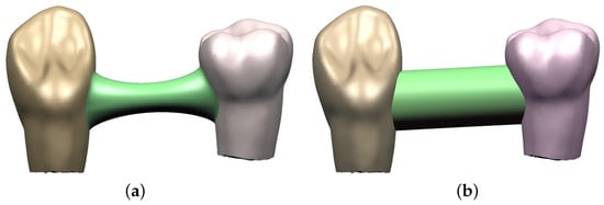 where . Figure 5a,c shows the examples of and for different control (scale) parameters and , respectively. This approach allows us to control the shape of blending surface by adjusting and . Figure 10 shows two extreme cases of generating blending surfaces when and while keeping the shapes of contact curves.