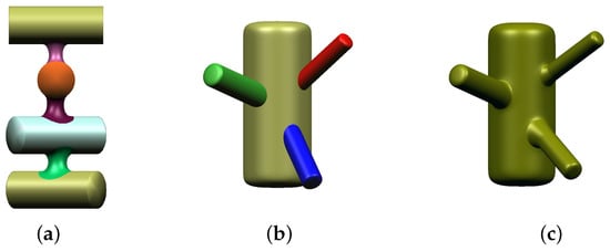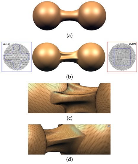 Figure 12a shows the blending surface that smoothly joins two sphere meshes. When we change the shape of boundary curves and as shown in Figure 12b, the blending surface changes its shape as shown in the middle figure. The result of merging the blending surface with trimmed meshes is detailed in Figure 12c,d.