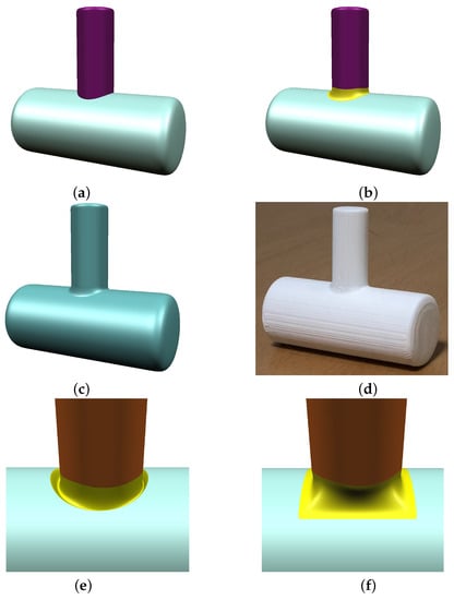 Similar to the rolling-ball methods [,,,], our method can also be used to generate a blending surface between two intersecting surfaces. Figure 15a,b shows two intersecting cylinders and the blending surface (in yellow) generated by using our method, respectively. Figure 15c shows the result of merging three surfaces after trimming unnecessary parts, and its 3D printing result without postprocessing is shown in Figure 15d. Compared with the rolling-ball methods, our method is more flexible for controlling the shape of the resulting surface. For example, the blending surface in Figure 15e is generated by setting and . In Figure 15f, we use the boundary curves of rectangular shape and to obtain the blending surface of a rectangular boundary curve. In rolling-ball methods, it would be quite difficult to control the shape of contact curves since they are automatically determined by the shape of the intersection curve between input meshes.
