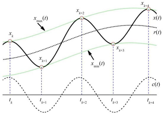 - In Equation (12), the term on the left-hand side is approximate to the differential of r(t) with respect to time t, and the first and the second terms on the right-hand side. To the differential of the curve xmax(t) between two local maxima and that of the curve xmin(t) between two local minima. With due regard to the behavior of r(t), xmax(t), and xmin(t) uniformly varying with time over the interval [tk, tk + 3], one has Equation (13).