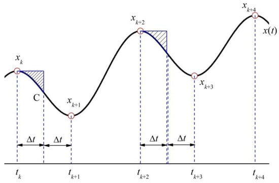 In Equation (8), ∆txk and ∆txk + 3 are approximate to two integrals of this equation, as shown in Figure 2. There are two shadow areas caused by this approximation. If they are almost equal to each other, such approximation is very good due to their difference considered here. Similarly, Equation (9) is also a good approximation when the other two areas in the integral calculation almost keep the same value. In Equation (10), the relevant two integrals have the same initial point, except for different end points. Both of them represent the integral means over their individual intervals with slight differences, and thus this equation should be a good approximation. Additionally, tm − tl approximated by 2 ∆t can be derived from the same step of movement for these two time points as that of their corresponding intervals.