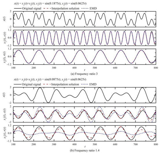 Once there are several tl on the interval (xk, xk + 2), tm on (xk + 1, xk + 3), or tn on (xk + 2, xk + 4) (impossible for all of them to occur simultaneously), Equations (12) and (13) simultaneously turn the exact relations into approximate expressions, which means that the central point of several tl, tn, or tm, or any one of them can also work well. Since the interval considered moves by a step of a half wave length, this relationship tl < tm < tn is always following. Examples of interpolation solution decomposition, as shown in Figure 3, illustrate that tl, tm, and tn should be located near the centre of their corresponding intervals. Affirmatively, more than one tl, tm, or tn will have influence on the effect of interpolation solution decomposition, but have little on the EMD.
