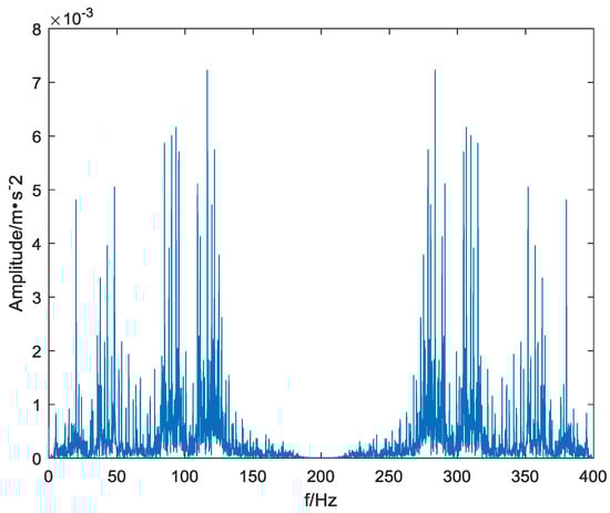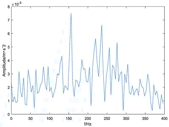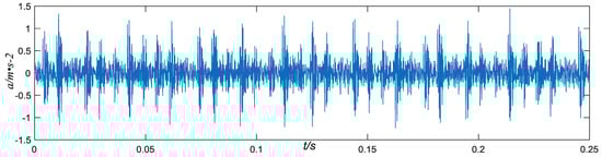 In order to further verify the adaptive advantages of the empirical mode decomposition algorithm, this experiment will analyze the bearing fault data. The experimental data comes from the Case Fault Database of Case Western Reserve University [25]. The fault signal of the inner ring of the drive end is selected to analyze the feature of the EMD method, and compared with the application effect of the wavelet method. Specific experimental procedures are detailed in References [26,27,28]. The experimental conditions are as follows: the drive end bearing adopts 6205-2RS JEM SKF deep groove ball bearing, EDM bearing single point damage, the damage diameter is 0.1778 mm, the motor speed is 1748 r/min, the sampling frequency is 12 KHz, the sampling time is 0.25 s (107.dat). The inner ring fault frequency can be theoretically calculated to be 157.8 Hz. The time domain waveform of the measured signal is shown in Figure 4. The spectrum of the waveform shown in Figure 4 is shown in Figure 5.