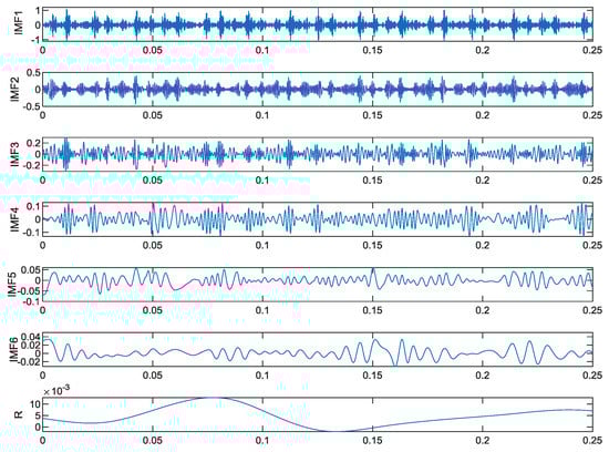 It can be seen from Figure 6 and Figure 7 that the EMD method only decomposes and obtains 7 IMF components, while the wavelet method decomposes to obtain 11 IMF components, and the 11 IMF components have redundant components. The main reason for this situation is that the wavelet method itself is not adaptive, its decomposition process is largely affected by the wavelet basis, and the EMD algorithm has a high degree of adaptive characteristics, which can be completely decomposed according to the characteristics of the signal itself.