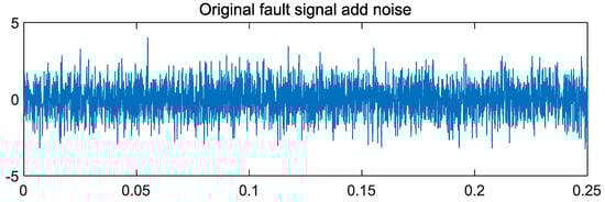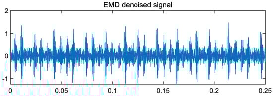At the same time, in order to further verify the effectiveness and reliability of the EMD method for noise-containing fault signal processing, random noise is added to the inner-circle fault signal in this experiment, as shown in Figure 13. The wavelet signal and the EMD method are used to denoise the noisy signal of Figure 13, and the results are shown in Figure 14 and Figure 15. It can be seen from Figure 14 and Figure 15 that the EMD method can better eliminate noise, and although the wavelet method also eliminates part of the noise, there is still significant noise information. The signal-to-noise ratio and root mean square error after noise removal by the two methods are shown in Table 1. It can be seen that the signal denoised by the EMD method, whether it is the signal-to-noise ratio or the root mean square error, is more advantageous than the signal after the wavelet method is denoised. At the same time, the computational efficiency of the EMD method is higher than that of the FFT method and the wavelet method. This is because the IMF component obtained by EMD decomposition is more favorable for later analysis.