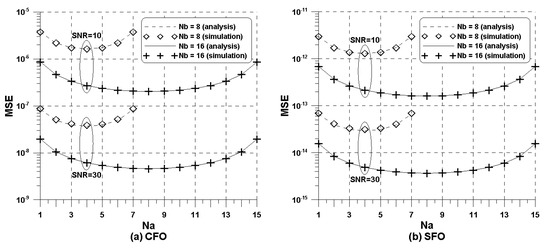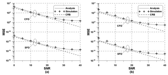 Since from the use of the optimal subset, substituting (44) into (29) and (30) produces the estimation error of the CFO and SFO estimator: