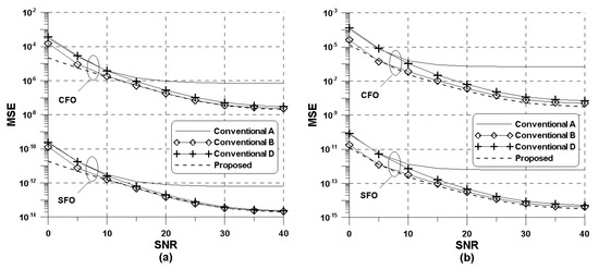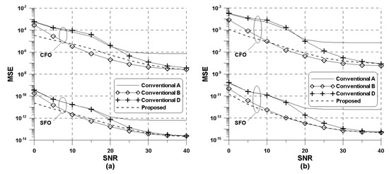 Performance of the proposed linear LSE (LLSE) method versus in the AWGN channel: (a) carrier frequency offset (CFO) estimation; (b) sampling frequency offset (SFO) estimation.