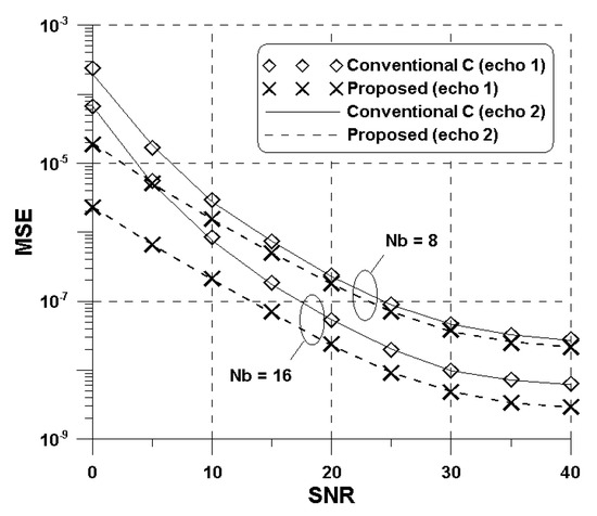 Figure 5 depicts the performance of the existing and proposed WLSE method in Echo Channel 1 and Echo Channel 2, using the same simulation parameters as in Figure 3 and Figure 4. In this example, the conventional WLSE scheme (18) using instead of is included, whereas the proposed scheme corresponds to (39). As predicted, we observe that the proposed WLSE approach still outperforms the conventional WLSE scheme with the aid of block-by-block estimation. It is clear that there is no significant performance difference between two echo channels in contrast to other methods, as illustrated in Figure 3 and Figure 4. This phenomenon is attributed to the fact that the WLS approach is able to mitigate the effect of frequency selectivity on the different subcarriers. Regarding the complexity of both methods, the flops of the proposed WLSE scheme when and 16 are reduced by 56.3% and 65.7% when compared to that of the existing WLSE method, respectively. Note that increasing eases the computational requirement of the proposed scheme at the sacrifice of estimation range.
