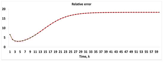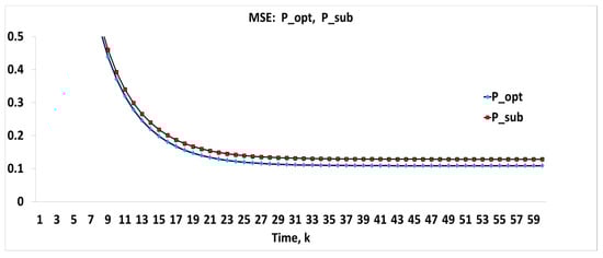 Thus, the KF Equation (31) with Formulas (32)–(34) completely establish the true MSEs for the optimal and suboptimal estimates, and respectively. The difference between and is equal to Figure 2 and Figure 3 show the MSEs and the relative error for the values and respectively. From Figure 3 we observe that the relative error varies from 3% to 6% within the time zone and then increases. In a steady-state regime, the relative error reaches the value and at the same time zone the absolute values of the MSEs are equal to and . Thus, the numerical results show that the suboptimal estimate may be significantly worse than the optimal one .