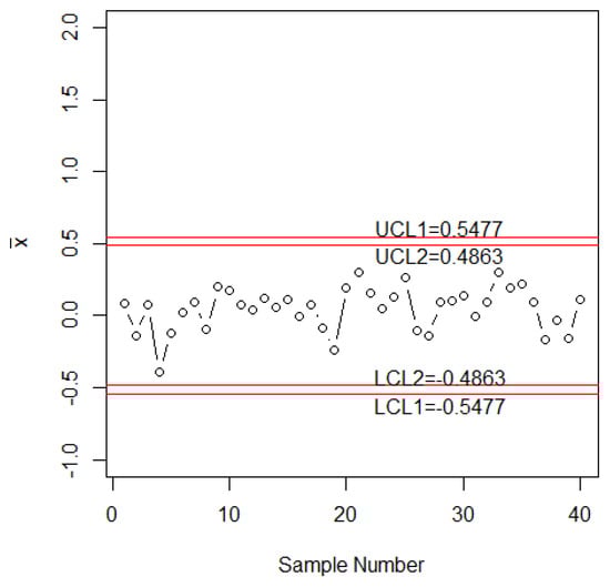 The control charts using a repetitive sampling scheme and multiple dependent state sampling are more efficient than control charts using a single sampling scheme [17,18]. Reference [19] introduced multiple dependent state repetitive (MDSR) sampling in the area of the acceptance sampling plan for lot disposition. They showed that MDSR sampling is more efficient in reducing sample size of the inspection lot as compared to repetitive and multiple dependent-state sampling. Reference [12] introduced the repetitive sampling in the area of the control chart which allows to repeat the sampling process if the plotting statistic lies in the in-decision state. Aslam et al. [13] introduced multiple dependent state (MDS) sampling in the area of control charts, which utilizes the previous subgroup information if the decision cannot be made based on the first sample. The MDSR sampling utilizes the previous subgroup information as well as repetitive process if the plotting statistic is in the in-decision state and the specified previous subgroups are not in the in-control state. By exploring the literature and to the best of the author’s knowledge, there is no work on variable control charts using MDSR sampling. In this paper, we will introduce the MDSR sampling scheme in the area of variable control charts. We will present the structure of the X-bar control chart using MDSR sampling. It is expected that the proposed X-bar chart will perform better than an existing control chart in terms of ARL. A simulation study and real example are given to illustrate the proposed control chart. In Section 2, the design of the proposed chart is given. The advantages of the proposed chart are given in Section 3. The industrial application is given in Section 4 and concluding remarks are given in the last section.