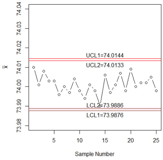 In this section, the application of the proposed control chart will be explained with the aid of an industrial example taken from Reference [2]. The data is about inside diameter measurements of forged automobile engine piston rings [2]. Each sample or subgroup consists of five piston rings. For this application, let = 5 and = 370. The control chart coefficients are = 2.9999 and = 2.7569. The four control limits are as: = 73.9875, = 73.9886, =74.0133 and =74.0144. The statistic is plotted on Figure 3.