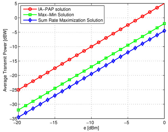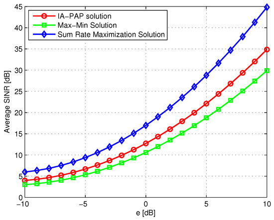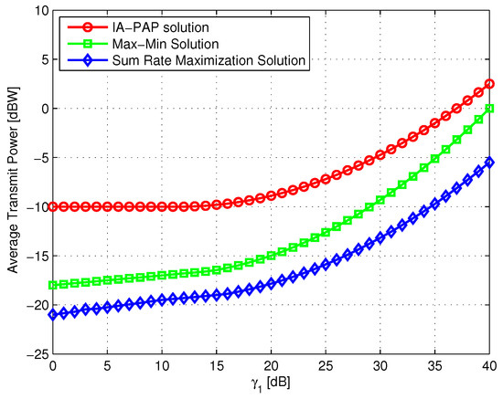 First, we study the transmission power required at the PU versus the SINR target for the proposed solutions, with fixed parameters ; all users’ EH threshold is dBm. Total transmit power is set to be equal to that of IA-APA solution under the same conditions. Figure 2 shows the performance comparison of the proposed solutions in terms of the minimum transmit power, and it can be seen that the sum rate maximization solution has the best performance. It is observed that, as the SINR is increased from 0 dB to 40 dB, more transmission power is needed, and the performance gap between the full IA solution and Max-Min solution gets closer, and Figure 2 also shows that the performance of all solutions is not sensitive to the increasing SINR targets at low to medium SINR; this is because the EH target is quite demanding.