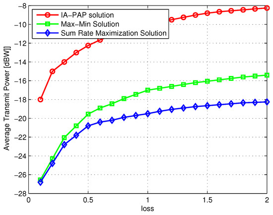 Next, we show in Figure 3 the minimum transmission power of the proposed solutions over with fixed dB, and . In Figure 3 the optimal solution achieves the minimum PU transmission power. Furthermore, the proposed solutions achieve notably smaller transmission power than that of the full IA solution because the PU designs its precoder selfishly in the proposed solutions.