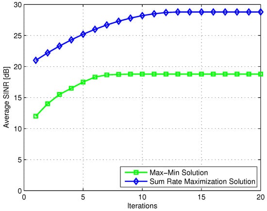 Finally, we provide numerical results to verify the fast convergence speed of the proposed solutions. The average achievable SINR of both sum rate maximization and Max-Min solutions is depicted as a function of iterations, with , dB, dBm and . In Figure 7 the proposed approaches converges in a few iterations. Our solutions indeed converge by iteration process.