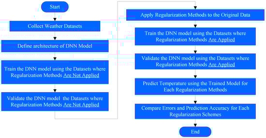 In the fifth step, regularization methods were applied to the original weather data. The applied methods will be described in more detail in Section 2.2. In steps 5 and 6, a defined model was trained and validated using the datasets. In step 7, the future temperature is predicted using the trained neural network model where regularization methods were applied. Finally, each scheme is compared by analyzing the train, validation, and prediction errors.
