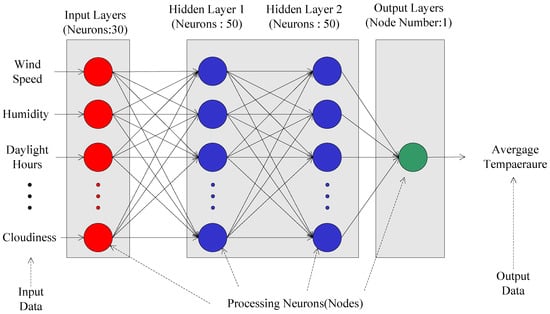 First, the datasets that were used to train and validate the neural network model were collected. In our experiment, the Korean weather dataset was collected from the government website. It included 35 features, including average temperature, maximum temperature, minimum temperature, average wind speed, average humidity, cloudiness, and daylight hours, for the previous five days. The average temperature was a target feature to predict for the next day. We let x(i) be a 35-dimensional feature vector for the ith set of five consecutive days, and let y(i) be the one-dimensional vector that contained this feature for the ith single day. The prediction of y(i) with a given x(i) can be expressed using Equation (1):