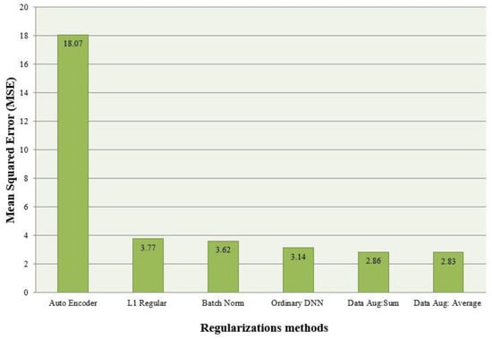 As it is shown in the figure, the autoencoder scheme was fairly high. For the other schemes, the values were not high. From the results, L1 regularization and the autoencoder still encountered overfitting and underfitting problems. The batch normalization showed better performance than these methods, as mentioned earlier. The DNN model with data augmentation showed the best performance.