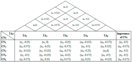 Step 2. Formulate the decision matrices for experts that denote the weights of each CRs, , the relationships between CRs and TAs, , the interrelationships between TAs and , and the assessments of alternatives concerning each TA.