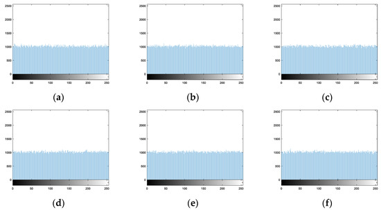For Suri’s algorithm, Figure 26a,b are the histograms of encryption images, respectively. Equations (27) and (28) obviously reduce the pixel numbers for the lower gray levels and higher gray levels. Therefore, these histograms are not uniform.