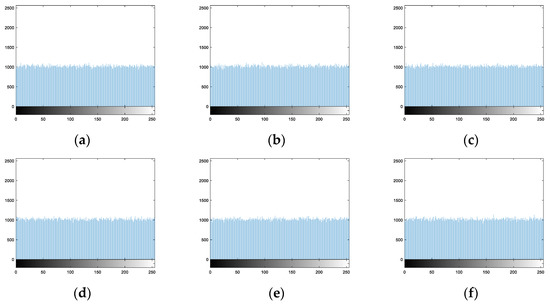 For Zhang’s Algorithms 2 and 3 and Das’s algorithm, Figure 23a–i, Figure 24a–i, and Figure 25a,b are the histograms of their encryption images, respectively. These algorithms not only scramble the pixel positions but also change the pixel values. Therefore, these histograms are very uniform.