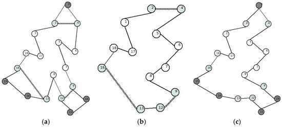 As an example, let us take the tour given in Figure 2a. In the example, 17 nodes are given. The internal nodes (modes in the cluster) are given in white colour. There are 6 border nodes given in grey and there are 5 external nodes in black. For the local optimization phase, three virtual border nodes are generated, the related pairs are denoted with thick edges. The cluster-level local optimization process involves 10 nodes. The generated local optimal tour is shown in Figure 2b. After uncovering merging with the external, hidden section, we get the new, refined global tour (Figure 2c).