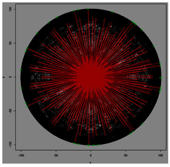 To demonstrate the complexity of the optimization landscape, we present an experiment in a low complexity permutation space. Figure 1a,b shows the space of all permutations (N = 6) positioned along a circle. The permutations are ordered by a lexicographic ordering, where means that there exists an index value such that for every , the node is on the same position in both permutations and for the element , the position in is less than in . The lines between two permutation nodes represent the neighborhood relationship. Two permutations are neighbored if they can be converted into each other by a single inversion transformation. The red ray lines from the centre represent the goal function (the route length) of the corresponding permutation. The largest route length has a zero ray length, while the longest ray segment denotes the minimum route length.
