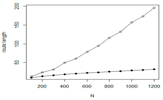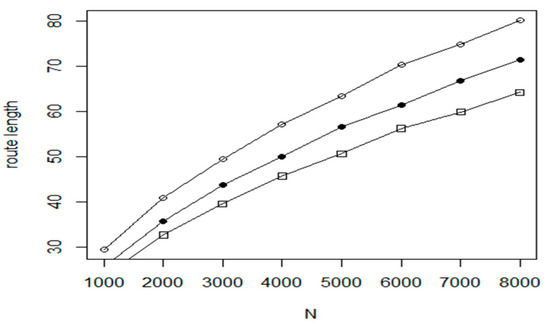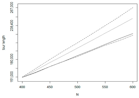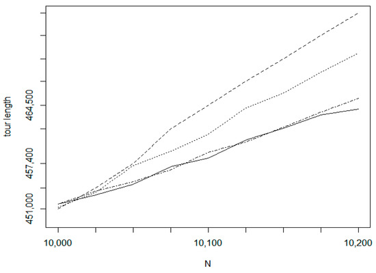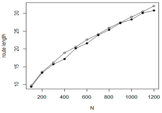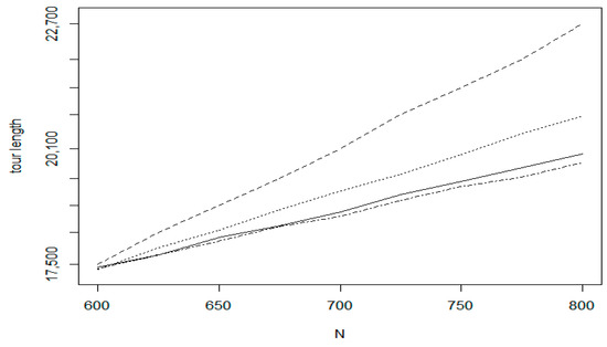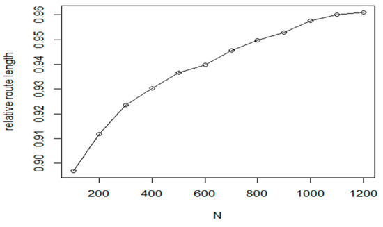 Considering the approximation efficiency of the insertion algorithms, Rosenkrantz et al. [32] has been proven that every insertion algorithm provides an approximation threshold O(log(N)). The Furthest insertion method that performs better than the other method has a constant lower bound [33] of 2.43 for eTSP problems. Regarding the efficiency of the Random insertion algorithm, Azar has proven in Reference [31] that the worst case approximation factor can be given with