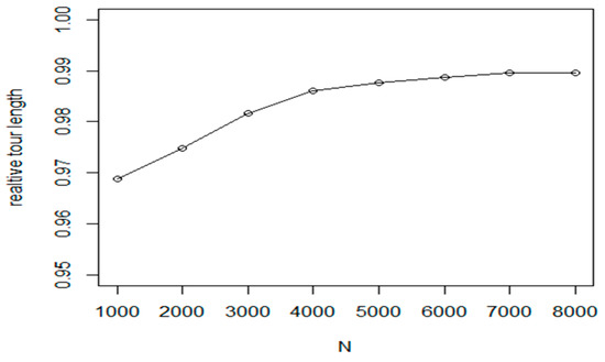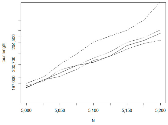 An important motivation was in our investigation the fact that the search space of larger TSP problems are significantly more complex than the search space of smaller problems. A deep analysis of the corresponding search landscape can be found in Reference [49] where a statistical model was introduced to estimate the number of local optima in the search space for different problems sizes. In the proposed method, random sampling technology is used to determine the corresponding model parameters. A similar analysis was presented later in Reference [50] for a larger problem domain. An important empirical result of the investigation on Euclidean TSP problems was that the number of local optima () grows exponentially in the function of the problem size (N):