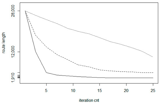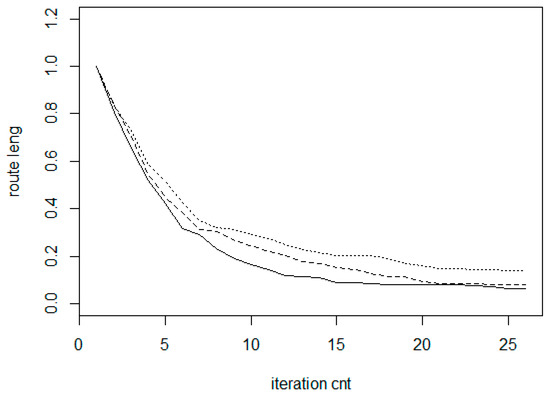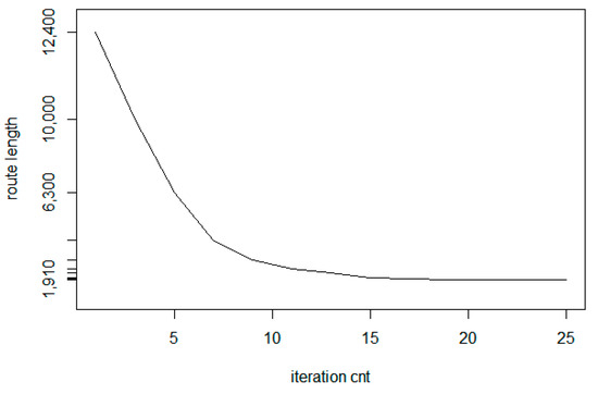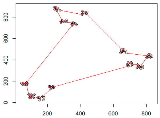 The idea of combining local clustering (segmentation) in generation of initial route is used in many current proposals. In the literature, we can find many variants of this segmentation approach, as Geometric Partitioning [41], Tour-Based Partitioning [42] and Karp’s Partitioning Heuristic (Karp) [43]. In more complex cases, like [44], the method constructs a hierarchy of segmentations in order to provide a cluster leaves with small amount of graph nodes. In Reference [17], the graph nodes are separated into four disjoint groups corresponding to the different sides of a rectangle. In Reference [45], the route generated by merging the cluster level clusters is refined with a genetic algorithm heuristic. In Reference [46], the genetic algorithm and the ant colony optimization are used to find the optimal local path for the clusters. In the final step, a simple method for choosing clusters and nodes is presented to connect all clusters in the TSP. The Tour-merging Method [27,35] is based on the observation that the routes of good quality usually share a large set of common edges. The algorithm uses specific heuristics to generate near optimal tours and specific dynamic programming techniques to unify the partial solutions into a common solution.