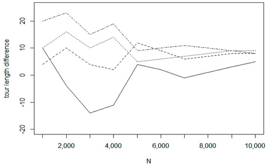 - Richter, D.; Goldengorin, B.; Jäger, G.; Molitor, P. Improving the efficiency of Helsgaun’s Lin-Kernighan heuristic for the symmetric TSP. In Proceedings of the Workshop on Combinatorial and Algorithmic Aspects of Networking, Halifax, NS, Canada, 14 August 2007; pp. 99–111. [Google Scholar]