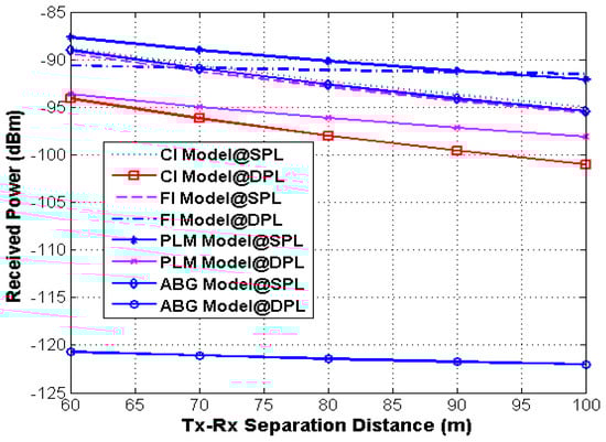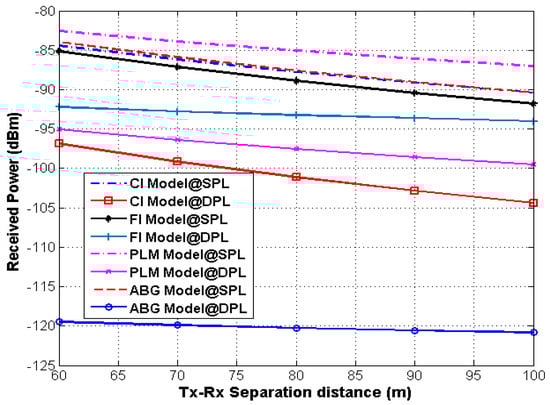 | Tx-Rx Separation Distance (m) | Path Loss Models | Frequency (GHz) | Scenarios | Power Received (Pr) (dBm) = Pt-PL |