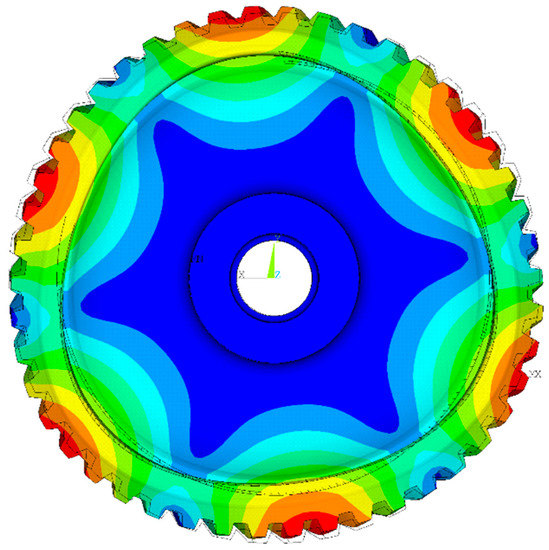 Therefore, in this study, we focused on nodal diameter vibration. For N nodal diameters (ND), the radial displacement of the groove of the gear can be assumed as