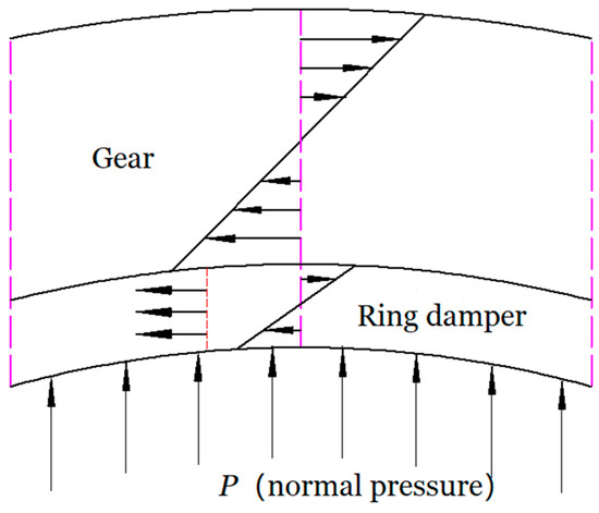 For ring dampers to be effective, they are typically located on the rim of the gear where large vibration amplitudes occur, as shown in Figure 1. Otherwise the energy dissipation due to friction will be reduced and even equal to zero, and the ring damper will be ineffective. Ring dampers are mostly effective only for the fundamental mode shapes of the gear [22]. These modes are characterized by a large amplitude at the rim of the gear. For thin-walled gears, friction damping is produced by the relative motion caused by the different extension deformations between ring dampers and gears along the tangential direction of the contact surface [23]. However, note that the circumferential deformation is caused by radial vibration. In other applications, for example train wheels, vibration energy is attenuated by the axial component of the vibration, and friction damping is produced by relative motion in the axial direction [15]. Zucca [22] analyzed the axial and circumferential relative motion of a bevel gear with a ring damper in different response conditions. The results show that although the radial and axial components of the vibration have the same order of magnitude, the ring damper worked mainly in the circumferential direction because the relative displacement along the circumferential direction is much larger than along the axial direction. No relative motion occurs in the radial direction due to the ring damper maintaining contact with the primary structure by centrifugal force.