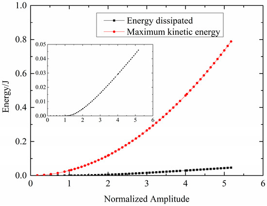 Energy dissipated per cycle by the ring damper and maximum kinetic energy of the system versus normalized amplitude.
