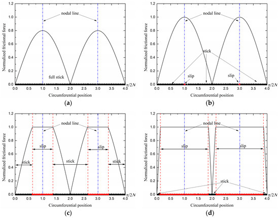 The normalized frictional force and the contact state between the gear and the ring damper along the circumferential direction are shown in Figure 9. In Figure 9a, when the vibration amplitude B is less than Bc, the contact state is stick. Thus, no relative motion occurs on the contact surface. Frictional force is a function of θ, and the maximum frictional force appears at the position of the nodal line. When B = Bc, slip appears at the position of the nodal line, as shown in Figure 9b. When B > Bc, the slip region expands to both sides as B increases, as shown in Figure 9c. When B ≫ Bc, the slip region increases slowly as the vibration amplitude increases. In this case, the contact status is approximately full-slip, as shown in Figure 9d. This observation is highly consistent with other studies [9,20], according to those studies, when the excitation frequency is far from the natural frequency, the response amplitude is small and the contact status is stick. When the excitation frequency gradually approaches the natural frequency, relative slip appears on the contact surface and the slip region gradually increases.