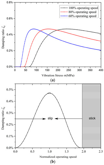 Figure 10 shows the effect of rotating speed on the equivalent damping performance. In Figure 10a, a decrement of the rotating speed causes the contact surface to slide more easily at a given resonance stress, resulting in a lower critical vibration stress. Also, the vibration stress corresponding to the maximum damping ratio decreases as the rotating speed decreases. In Figure 10b, for a given resonance stress, when the rotating speed is greater than about 1.9 times of the optimal rotating speed, the contact surface is full-stick, where the optimum rotating speed is defined as the rotating speed corresponding to the maximum damping ratio.