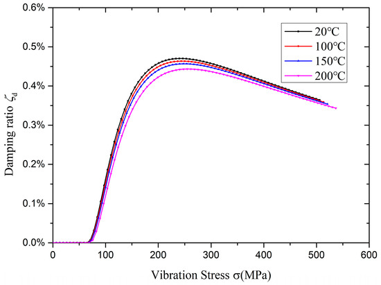 Figure 11 shows the effect of temperature on the damping performance. The effect of temperature is negligible. This, of course, is because the change in Young’s modulus E is small during the operating temperature range. The stiffness of the ring damper is almost unchanged. This also indicates that the ring damper can work at high temperatures and with good temperature adaptability.