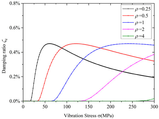 As shown in Figure 13a, the effect of the friction coefficient μ on the damping performance is similar to density. Increasing μ results in an increase in critical vibration stress. Moreover, in this case, the contact surface tends to be full-stick due to an increase in μ. In contrast, a decrease in μ results in the contact surface tending to be full-slip. However, due to Ff max = μP, the maximum frictional force on the contact surface Ff max decreased with a decrease in μ. For a given vibration stress, there is an optimum density that maximizes frictional damping. When the density is greater than 3.7 times the optimal density, the ring damper will cease to be effective again, as shown in Figure 13b.