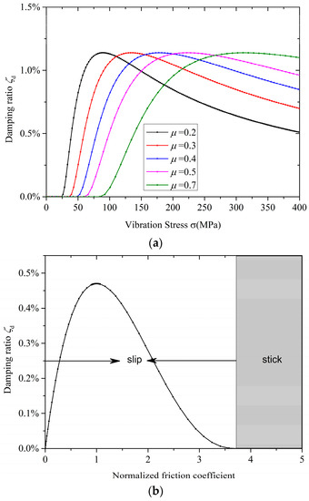 Effect of the friction coefficient:(a) Friction damping at various friction coefficient; (b) friction damping for normalized friction coefficient (for a given vibration stress).