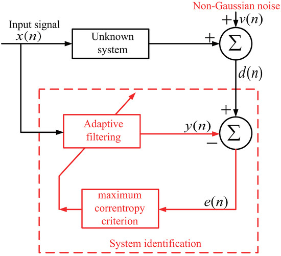 We consider a sparse system identification within the MCC framework shown in Figure 1. From Figure 1, we can see that the MCC-based adaptive filtering is to mimic the entropy error that is a difference between output and desired signal under non-Gaussian noise . As we know, the entropy is to quantify the uncertainty with designated random variables, and, hence, the minimized errors are concentrated. Herein, we discuss the MCC algorithm based on a linear system given in Figure 1. From the system identification theory, is depicted by: