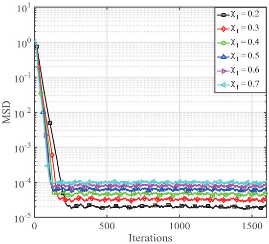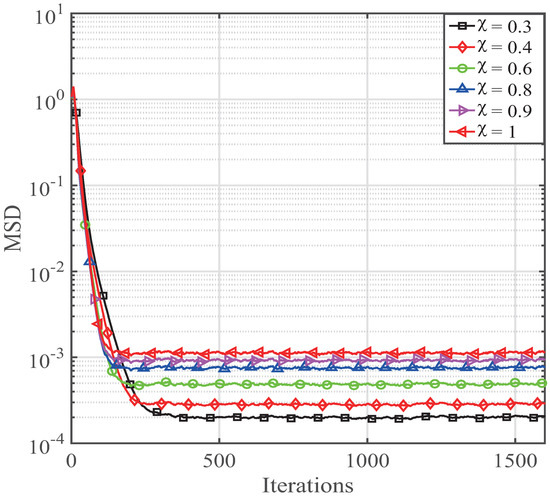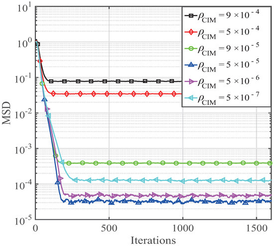 Similarly, the parameter is also selected to understand the performance of the derived CIM-PNMCC, whose performance is described in Figure 3. The CIM-PNMCC’s convergence speed rate becomes faster when increases from 0.2 to 0.7. However, the estimation misalignment is getting worse with an increment of . Additionally, is a zero attraction controlling parameter, which is designed to trade off the sparsity development and estimation bias. The effects of on the CIM-PNMCC estimation behavior is illustrated in Figure 4. It is observed that the estimation bias of the CIM-PNMCC is reduced as ranges from to . If is reduced from to , the estimation bias rebounds towards the opposite direction. Therefore, we should choose proper parameter value to obtain good performance of the PNMCC and CIM-PNMCC algorithms.