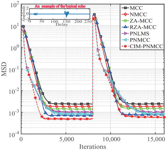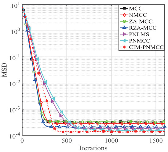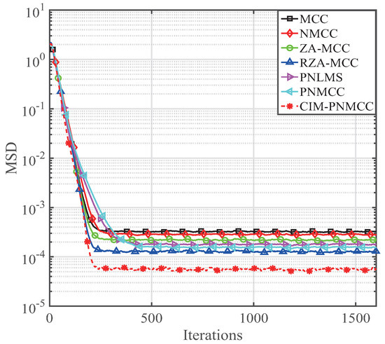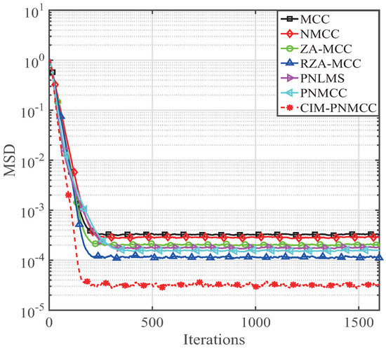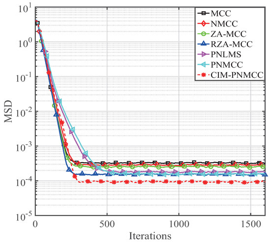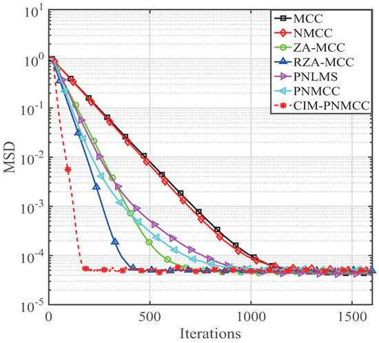 Then, these parameters are used to obtain the convergence speed investigation of the developed PNMCC and CIM-PNMCC algorithms. Here, , , , , , , , , , , where , , , , are step-sizes for NMCC, MCC, RZA-MCC, ZA-MCC and PNLMS algorithms. and are the regularization parameters for RZA-MCC and ZA-MCC, respectively. The convergence comparisons for PNMCC and CIM-PNMCC algorithms are given in Figure 5. From Figure 5, we observe that the PNMCC converges faster than the PNLMS and NMCC algorithms. It is worth noting that our developed CIM-PNMCC gets the fastest convergence speed for adaptive system identifications. The CIM-PNMCC algorithm only needs 200 iterations to reach a steady-state MSD, while the previously reported RZA-MCC algorithm requires more than 400 iterations to get its steady-state MSD. Thereby, the CIM-PNMCC algorithm converges much quicker than the RZA-MCC algorithm for achieving the same MSD.