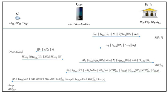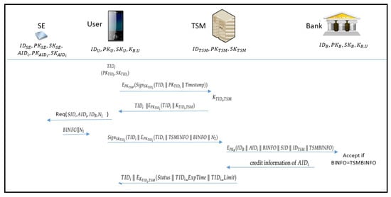 In short, at the end of the stage, a user with identity has ; TSM with identity has a symmetric key , a DL-based public/private key pair ; the bank with identity has a symmetric key , a DL-based public/private key pair and a as the one shared with . All those keys are generated in advance before the starting of our protocol.
