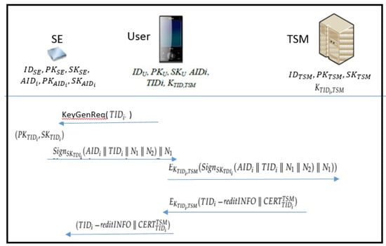 - The user generates transaction message and encrypts and with . That is, user sends to TSM.