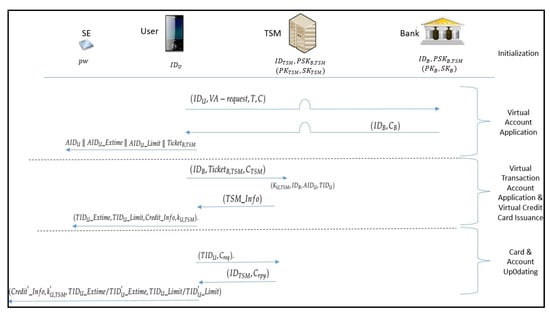 Confidentiality is considered in three parts; the confidentiality between the user U and the bank during the virtual account application phase, the confidentiality between TSM and the user, and between TSM and the bank during the virtual transaction account application and virtual credit card issuance phase, and the confidentiality between the use and TSM during the account update phase.