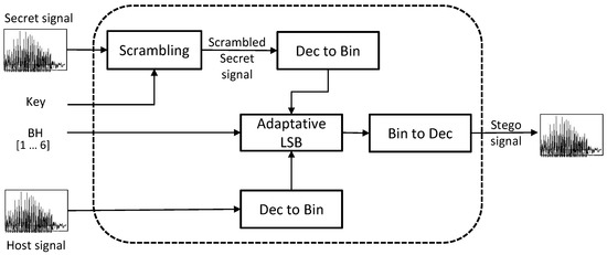 This block carries out the hiding process of the binary information derived from the scrambled secret signal within the binary information of the host signal. In contrast to the LSB classic method, a fixed number of the least significant bits from the host signal are not modified, but the total of modified bits depends directly on the sample range and the input parameter. The higher the sample value, the higher the number of bits that can be modified. In this case, bits numbered from the most significant bit “1” from the input data are preserved intact, and only the remaining less significant bits (LSB) are modified.